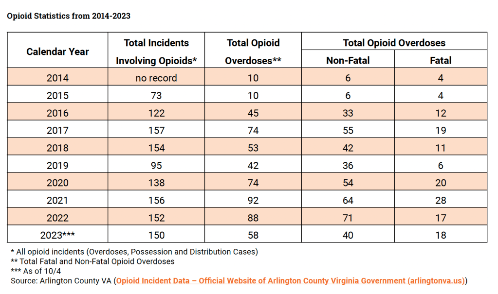 How has Arlington responded so far? The County’s Arlington Addiction Recovery Initiative (AARI) has been busy providing free training and distributing naloxone supplies throughout the community over the past year. This summer, Arlington Public Schools (APS) made naloxone doses and training available to teachers and staff. Narcan is available in the school nurses’ offices in our middle and high schools. In summer 2023, the School Board changed APS’ policy to allow students to carry naloxone in school. Also this summer, the Department of Human Services (DHS) on Washington Blvd opened and staffs a 24–hour drop-in Crisis Intervention Center to stabilize children and adults who are experiencing a substance use or mental health crisis. And at the County Board meeting held on November 14, 2023, the Board dedicated $750,000 in end-of-year closeout funds to fund some of the prevention ideas being suggested by advocates—including extending Parks and Recreation after-school programming to students and starting a public awareness campaign. These actions have been important first steps in addressing this growing crisis in our community.