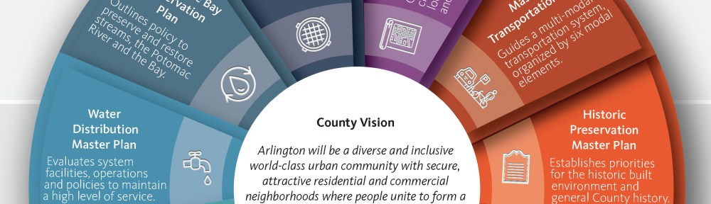 Did you know that every jurisdiction is required to have a comprehensive plan to guide its current and long-range development? According to Article 3, Section 15.2-2223 of the Virginia code, the Planning Commission in each jurisdiction has the duty to prepare and recommend the comprehensive plan elements, and the governing body—in our case, the Arlington County Board—has the responsibility of adopting the plan for the County. Sections of the code define the required plan elements and outline guidelines for a Transportation Plan that designates a system of transportation infrastructure, and “…shall include, as appropriate, but not be limited to, roadways, bicycle accommodations, pedestrian accommodations, railways, bridges, waterways, airports, ports, freight corridors, and public transportation facilities.” (Source: Code of Virginia, Section 15.2-2223.B.1.) The code also mandates specific elements be included, such as a zoning ordinance, public and private development (including commercial, general residential, and affordable housing development), community services and facilities, historic areas, groundwater and sewer treatment, and consider strategies to address social well-being, health, the economy, and the environment.