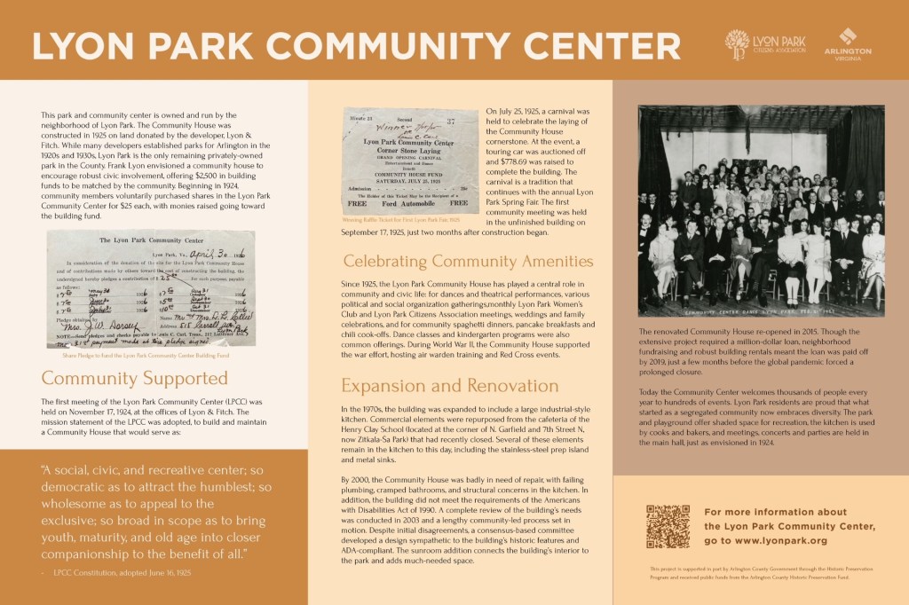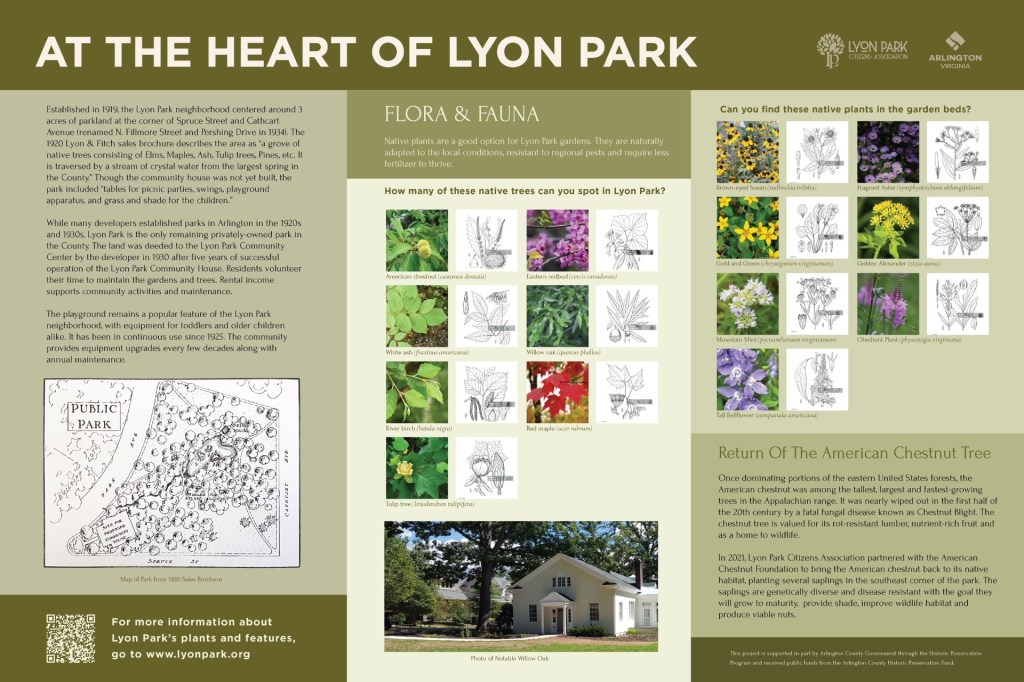 As part of the grant from the Arlington County Historic Preservation Fund, we have created signs that will be placed in Lyon Park to bring awareness about the history of the park, the community center, and the native plants and trees in the park. Please take a moment to review the signs and send any comments, suggestions, or corrections to lyonparkeditor@gmail.com no later than October 30.