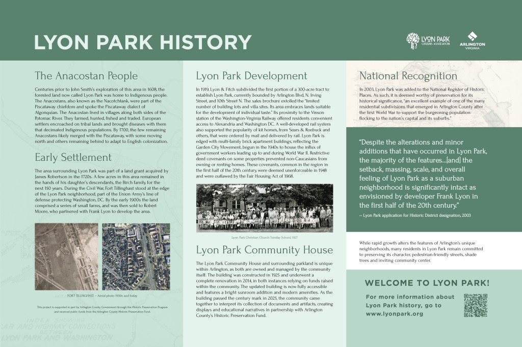 As part of the grant from the Arlington County Historic Preservation Fund, we have created signs that will be placed in Lyon Park to bring awareness about the history of the park, the community center, and the native plants and trees in the park. More information about the Lyon Park History sign will be forthcoming. In the meantime, please enjoy some information about the history of Lyon Park that was prepared by our historical committee.