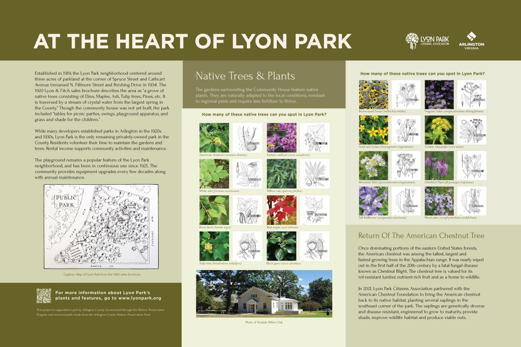 As part of the grant from the Arlington County Historic Preservation Fund, we have created signs that will be placed in Lyon Park to bring awareness about the history of the park, the community center, and the native plants and trees in the park. More information about the At the Heart of Lyon Park sign will be forthcoming.
