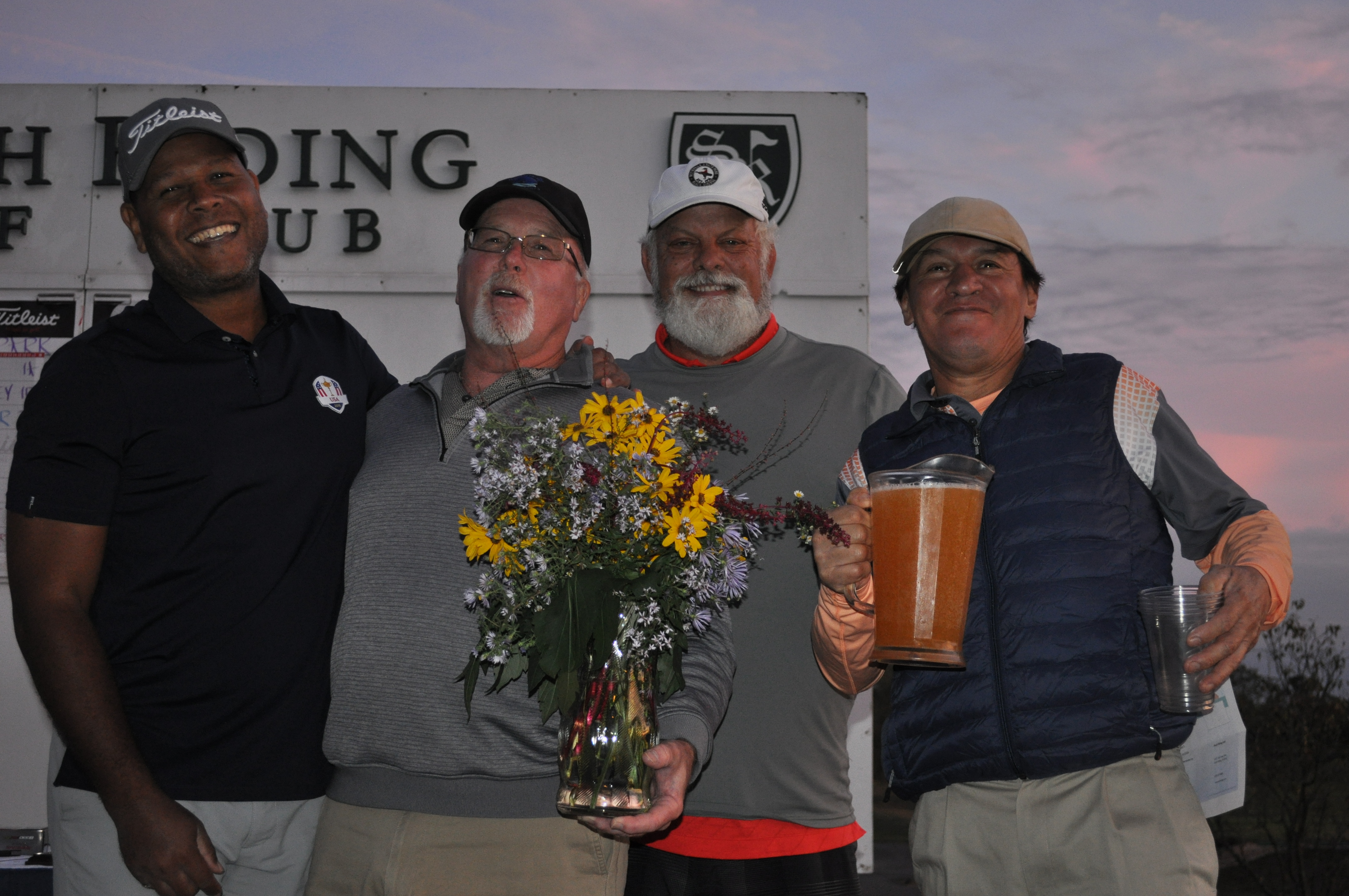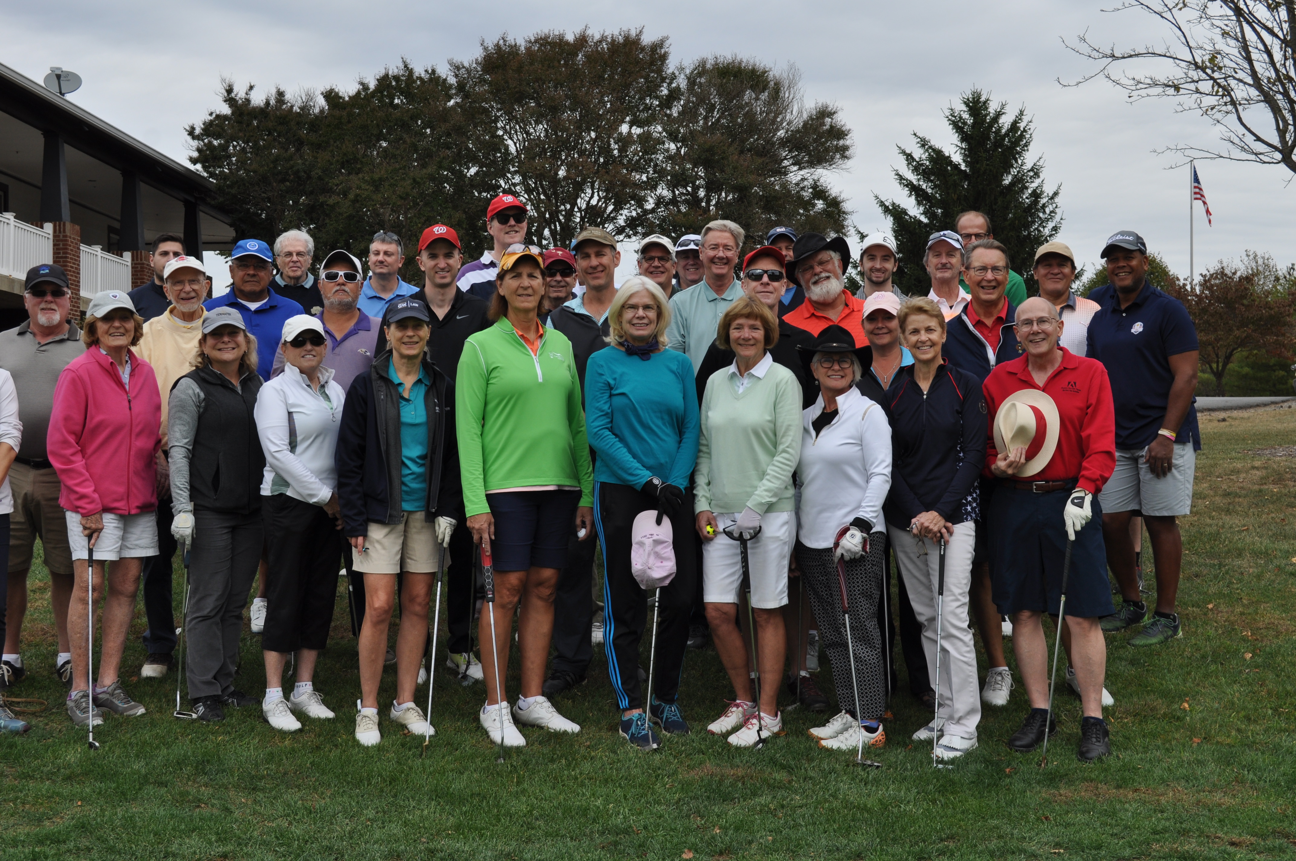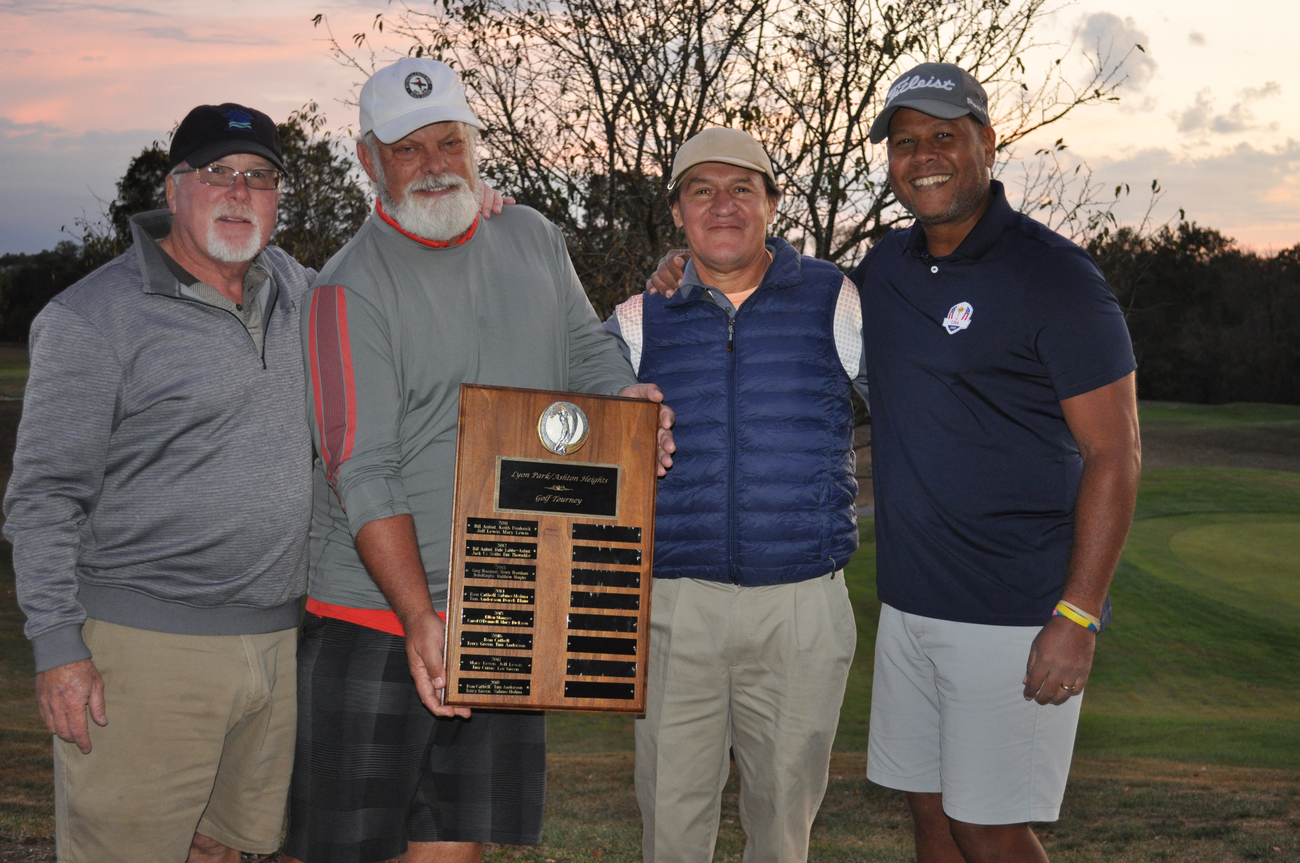 A record number 39 players participated in the 2019 Lyon Park / Ashton Heights Golf Tourney at South Riding Golf Club on Sunday October 13, 2019. Two teams tied for first place. Lyon Parker Chris O’Donnell and her team including Ellen Manges and Tracey Switzer shot a sixteen-under par 56, as did the Ashton Heights team of Ron Cathell, Tim Anderson, Al Johnson and Sabino Molina. However, the Cathell team won the tie-breaker and the 2019 Championship trophy, by tie-breaker rules. Greg and Henry Bramham, Bobby Hong and Wally Hays finished 3rd, a stroke back at fifteen under par.